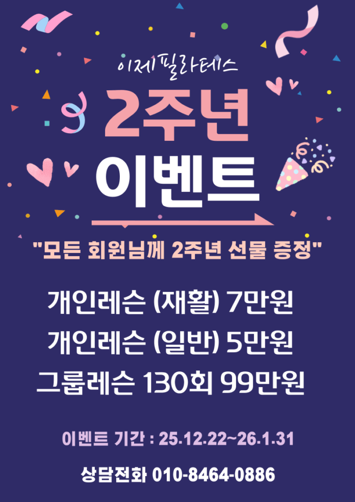 인천 남동구 만수동에 있는 이제 필라테스에서 2026년도 2주년을 맞이하여 특별한 이벤트를 연다고 알렸다. 2024년 1월에 재 오픈한 이제 필라테스는 물리치료사 원장 두 명이 운영하는 센터로 기존 필라테스와는 차별화된 재활·통증·교정 운동에 초점을 맞추고 있다.