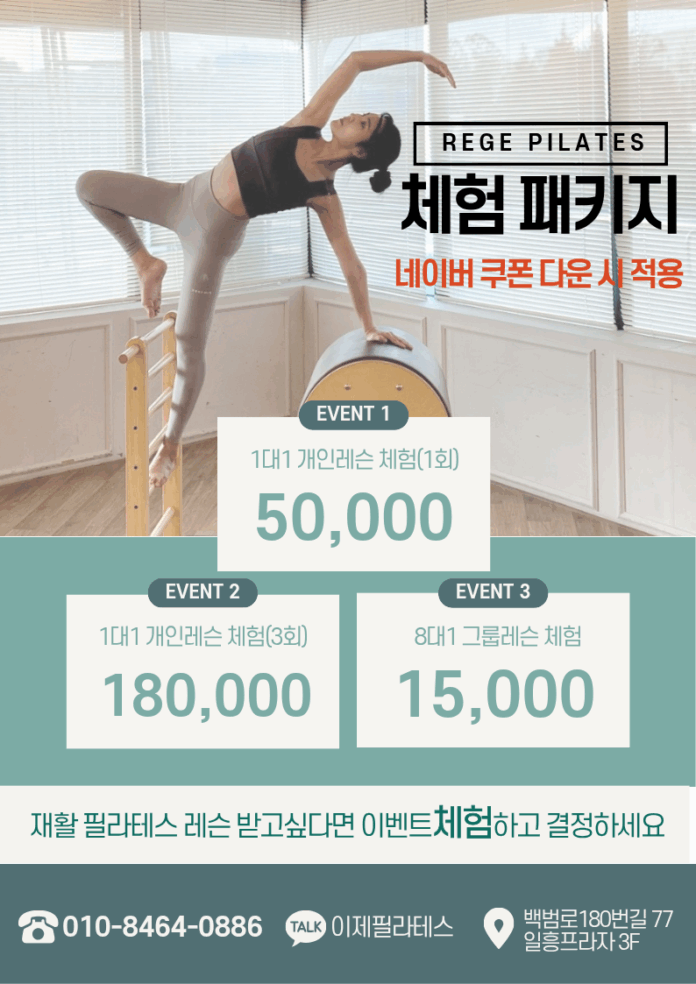인천 만수동에 위치한 이제 필라테스에서 신규 가입자를 위한 체험 패키지 상품을 등록했다. 네이버에서 이제 필라테스를 검색하면 인천시 남동구 만수동에 위치한 업장이 나오는데 거기서 체험 상품 안내와 함께 50% 할인 쿠폰을 다운 받을 수 있다.