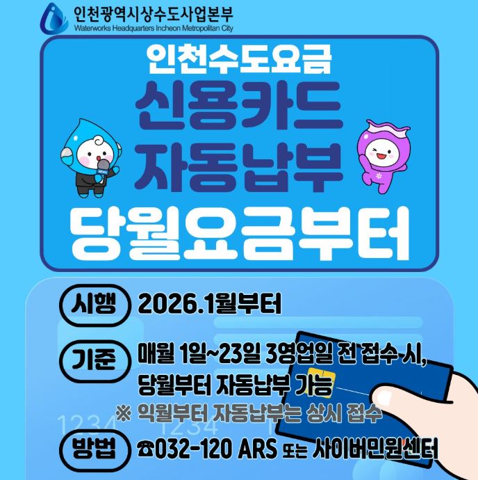 개정된 지침에 따르면 2026년 1월부터는‘매월 1일에서 23일(납부기준일) 3영업일 전까지’전화(☏032-120, 미추홀콜센터) 또는 누리집(인천상수도 사이버민원센터)을 통해 신용카드 자동납부를 신청하면 해당 월에 청구된 수도 요금부터 자동납부가 진행된다.