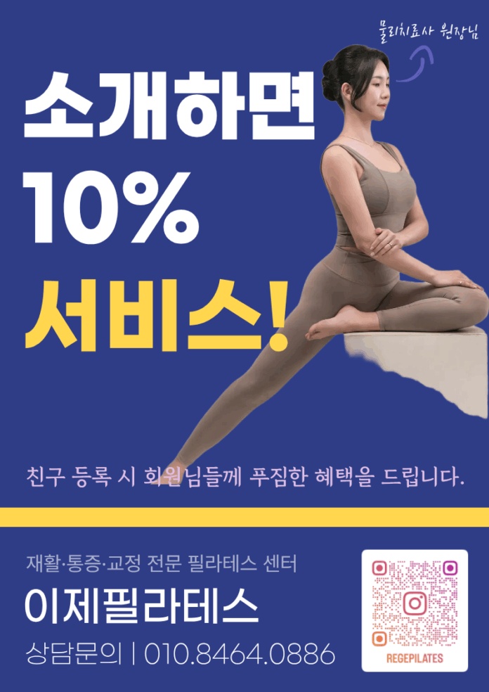 인천시 남동구 만수동에 위치한 이제 필라테스에서 친구 소개 이벤트를 진행 한다고 전했다. 기존 친구 소개 이벤트는 다락방 카페 쿠폰이 나갔었는데, 이번 이벤트에서는 소개 해주는 회원들에게 새로운 회원 수강권 금액의 10%만큼 횟수 서비스가 지급될 예정이다. 예를 들어 A회원이 B회원을 소개해서 B회원이 100만원의 수강권을 등록한다면 A회원에게 100만원의 10% 금액인 10만원어치의 서비스가 지급되는 내용이다. 서비스 내용은 그룹 레슨 회 차 제공이다. 현재 그룹 레슨 회 차 제공 가격은 회 단가 1만5천원으로 계산된다.