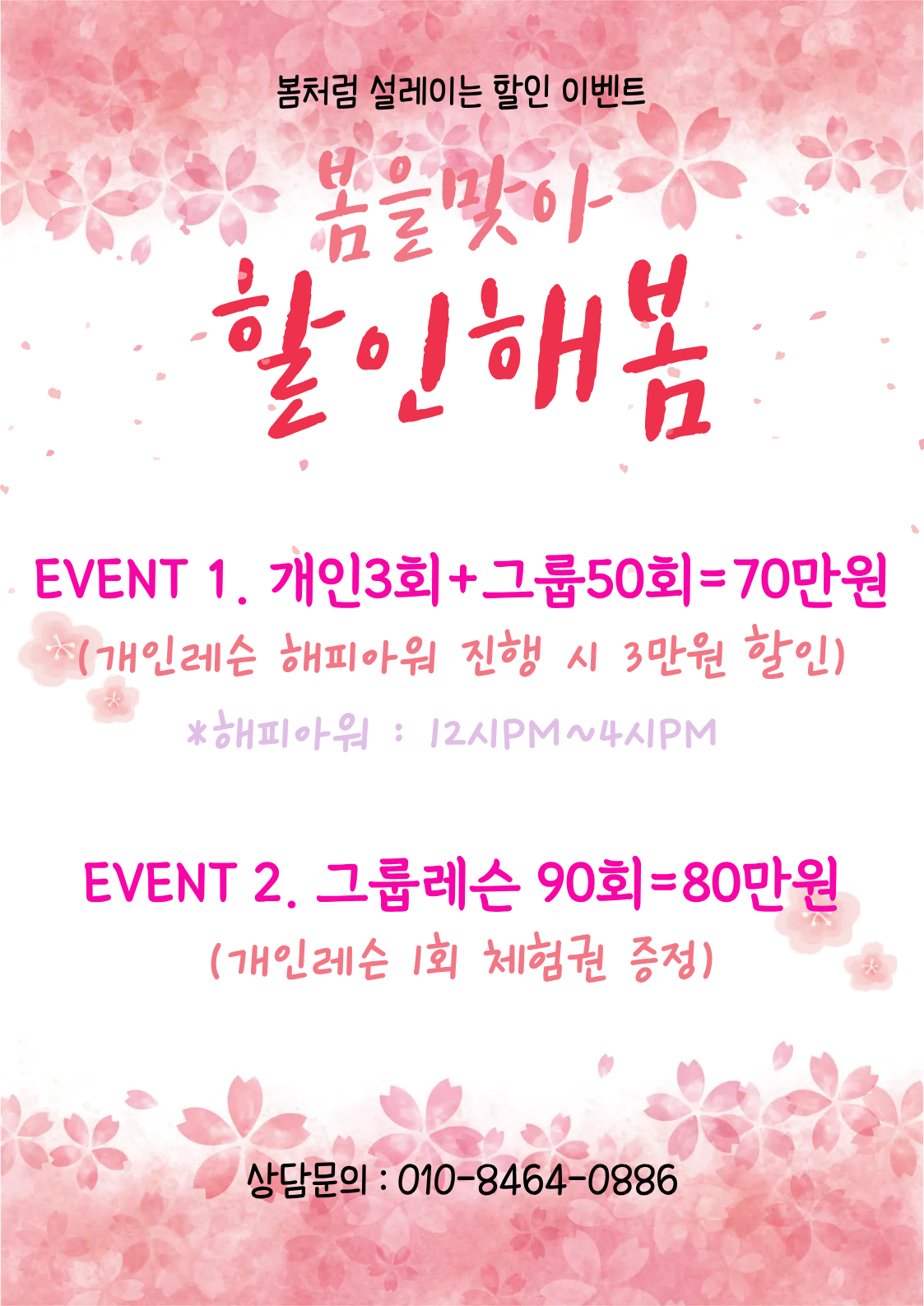 3월에는 따뜻해지는 봄 날씨와 함께 신학기가 시작되면서 운동 센터를 찾는 회원들이 늘어나는 시기인데, 이때 회원을 유치하기 위해 각종 이벤트나 홍보를 진행하는 곳이 많아진다. 이제 필라테스에서도 봄이 다가오면서 필라테스 센터를 찾는 회원들이 늘어나는 시기를 생각하여 금액적으로 혜택을 드린다고 말했다.