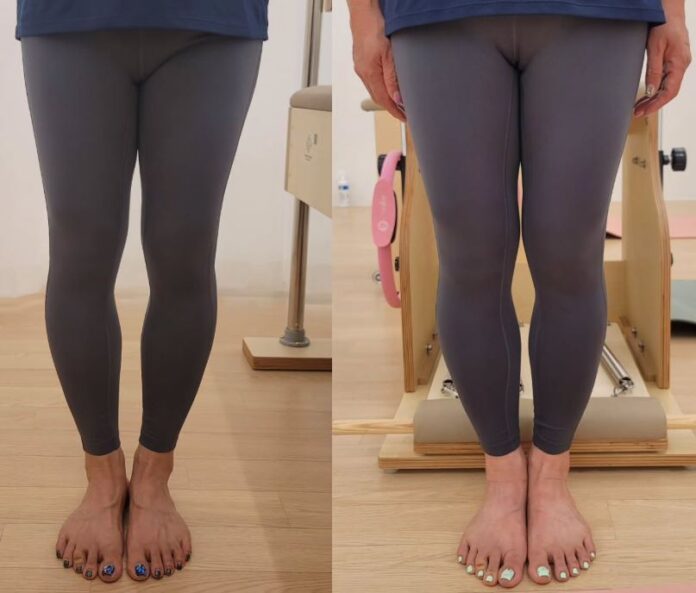 오늘 사례를 들어볼 이제 필라테스 회원의 사진을 보면 전/후 사진에 무릎 사이 간격의 차이가 있는 것을 확인 할 수 있다. 이 회원은 스스로 오다리를 인지하고 다리 모양 때문에 짧은 반바지는 물론 레깅스처럼 다리 라인이 다 드러나는 옷을 절대 입지 않았다고 전했다. 무릎 안쪽 통증이 조금 있기는 하나 일상 생활 하는데 큰 지장은 없었고, 자녀가 건강을 위해 운동하라고 필라테스 등록을 해줘서 다니기 시작했다고 했다. 회원은 “이왕 돈주고 운동 시작 한거 다리 교정이 되었으면 좋겠어요.”라고 말했다.
